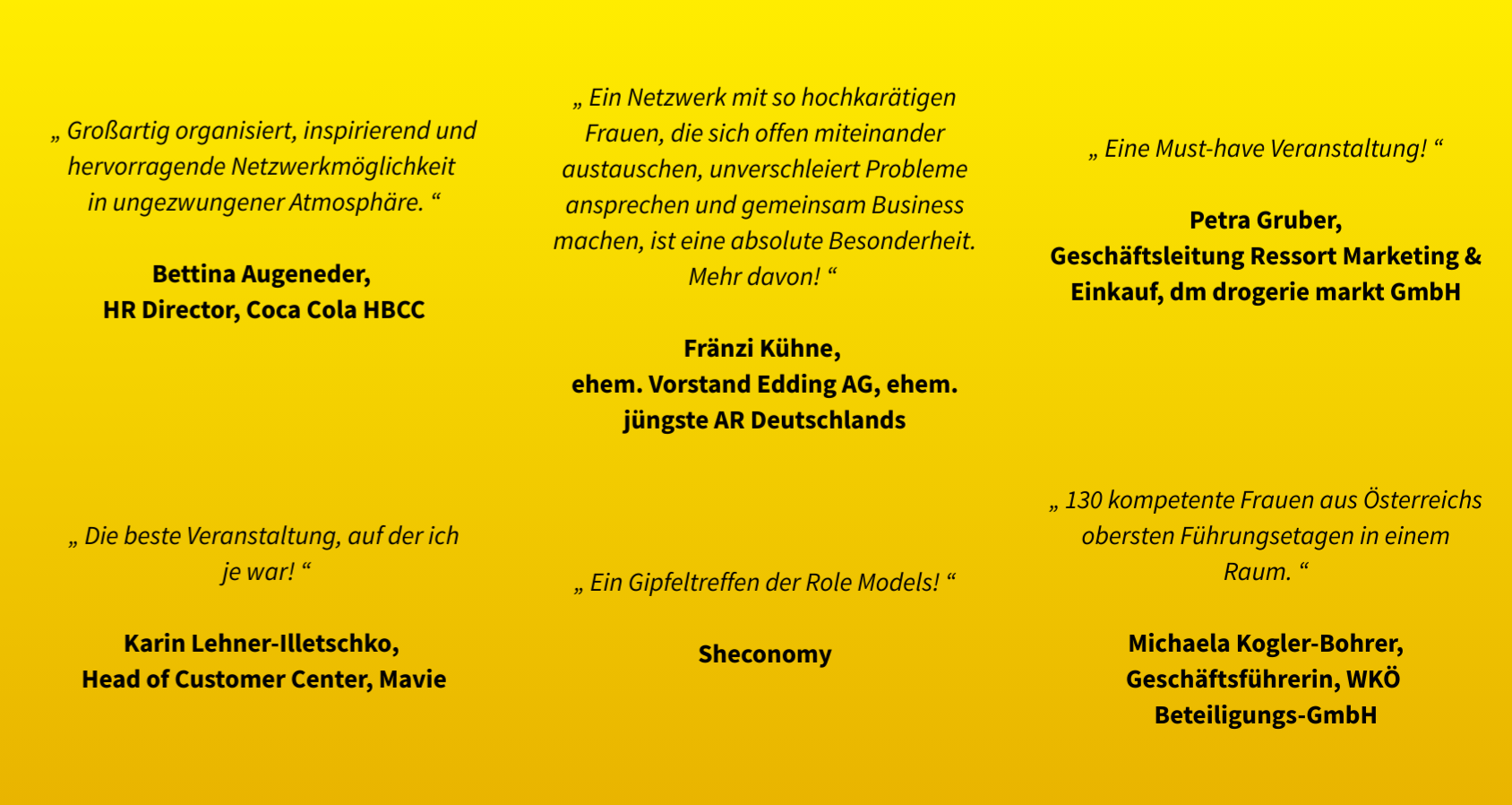 Jede Geschäftsbeziehung beginnt mit einer ersten Begegnung – genau dafür steht der Female Leader Circle. Wir laden 130 tolle weibliche Führungskräfte funktions- und branchenübergreifend ein, um sich zu ihren Business Themen auszutauschen, voneinander zu lernen, Synergien zu nutzen und Geschäfte miteinander zu machen. Es geht dabei darum miteinander ins Tun zu kommen. Und das mit einem einzigartigen Konferenzkonzept. Sie stellen sich Ihre Agenda individuell zusammen, vereinbaren sich über unser Online-Matching-Portal Einzelgespräche mit den anderen Führungskräften zu Ihren Themen und lassen sich von SprechernInnen inspirieren, die über den Tellerrand schauen.